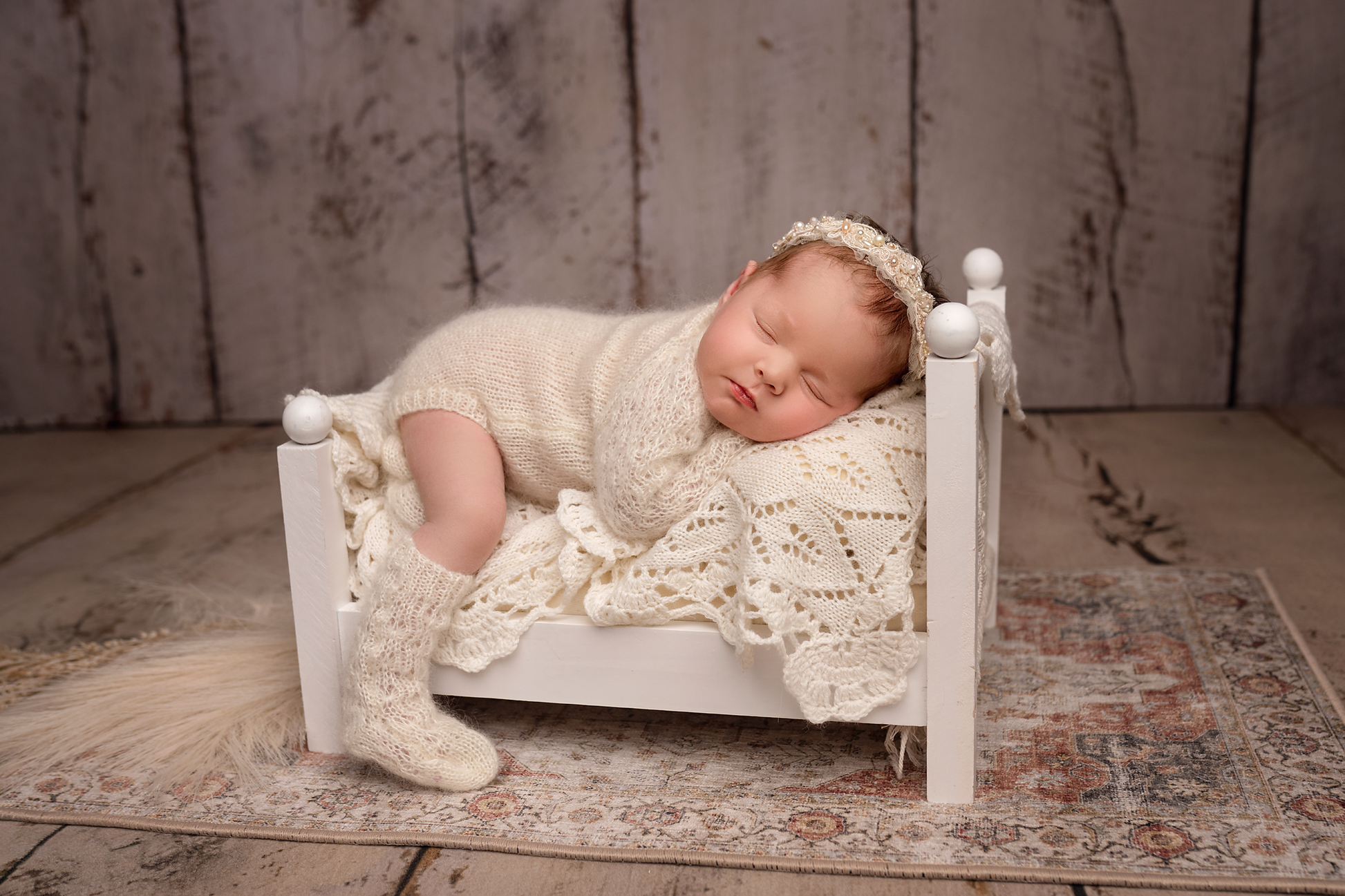 Includes a vintage layer and alpaca newborn romper with matching socks and bonnet in White/offwhite (as pictured)