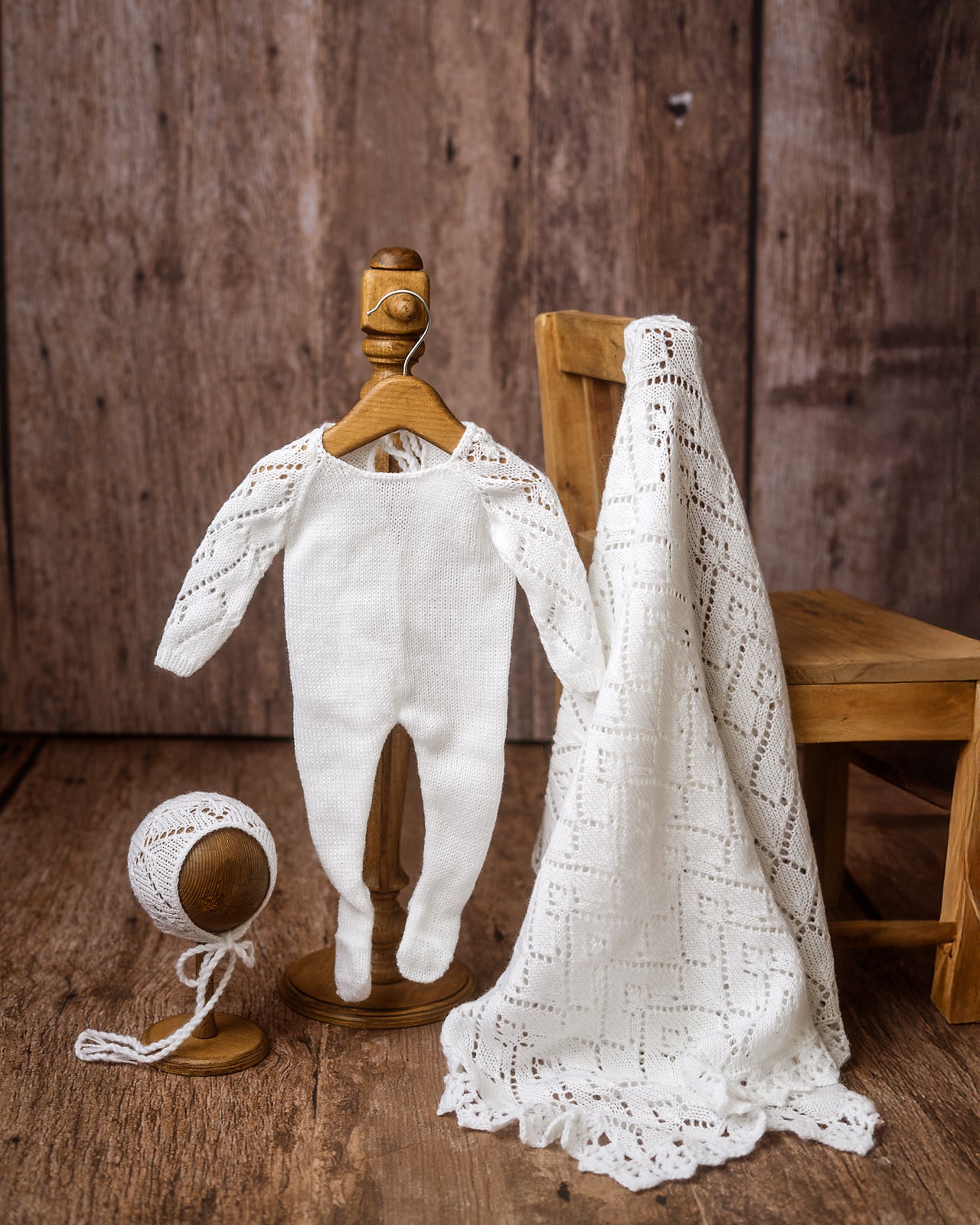 Tight-fit newborn romper with beautiful lace detailed sleeves and matching, detailed bonnet & matching XXL blanket