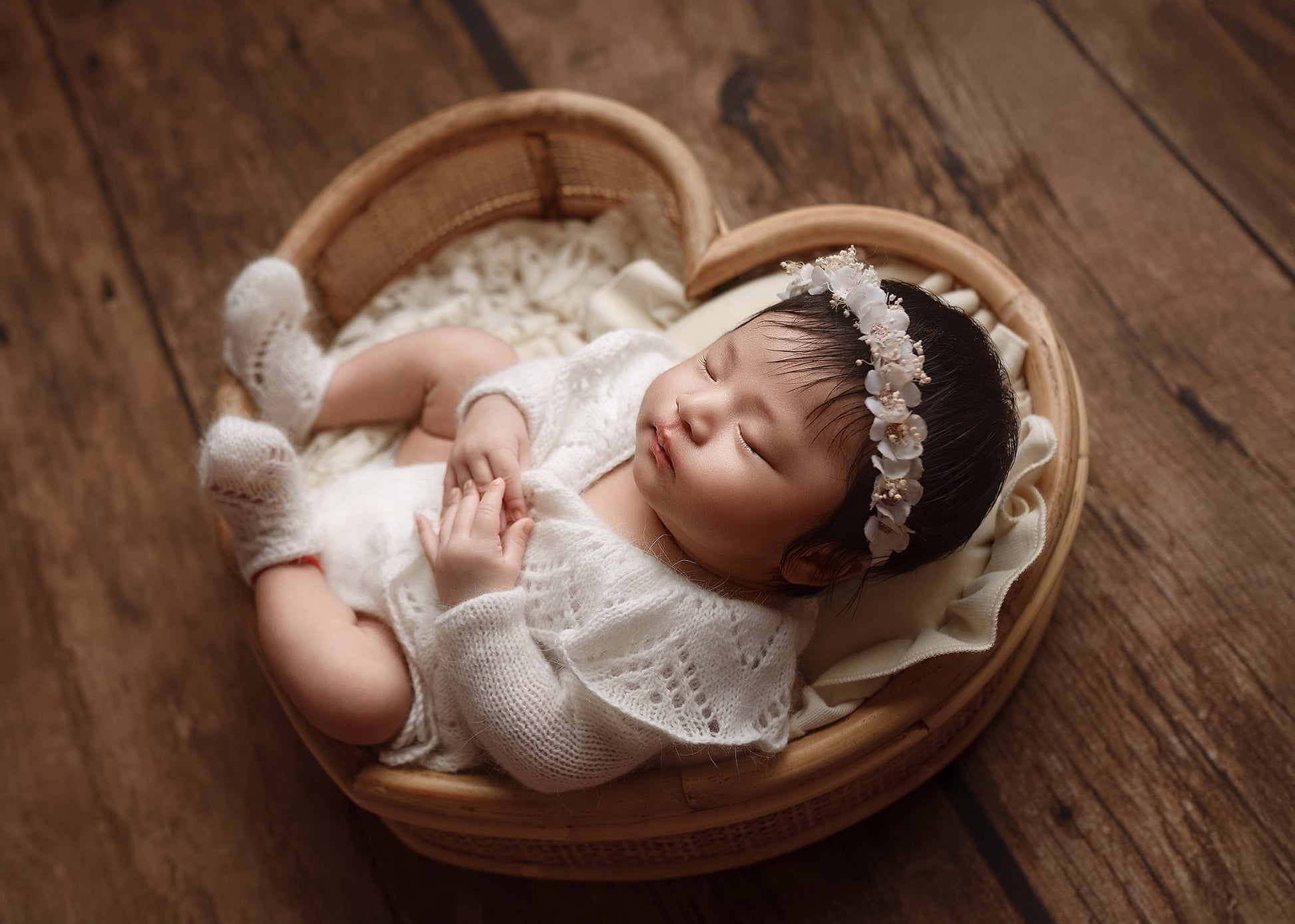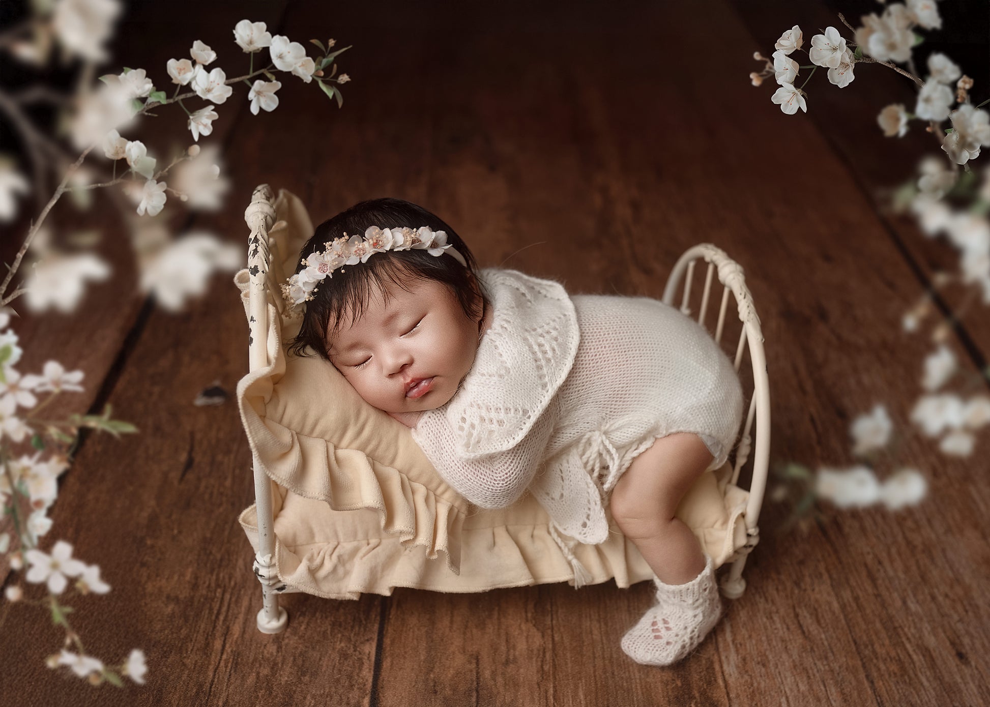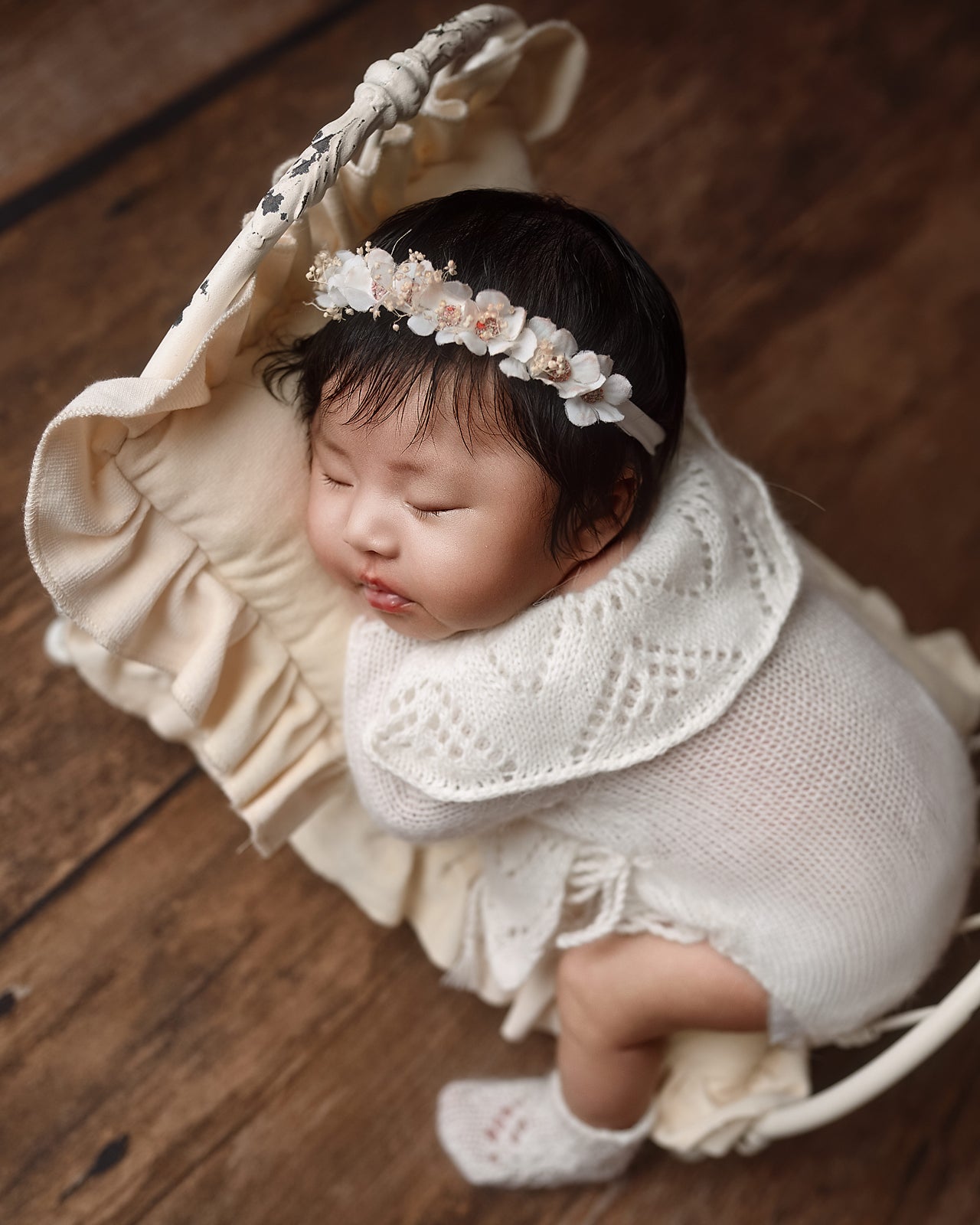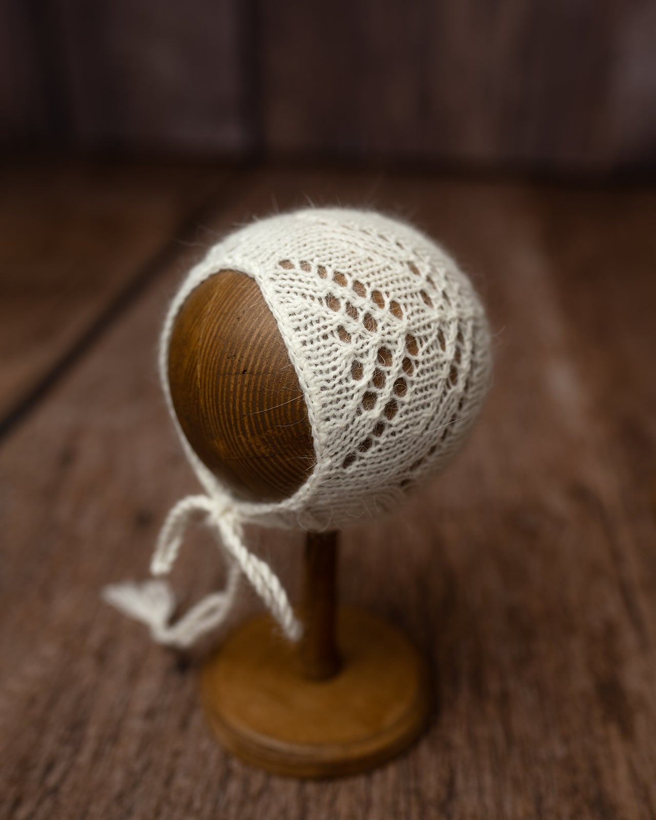 Delicate, cashmere romper with lace details, matching bonnet and socks.